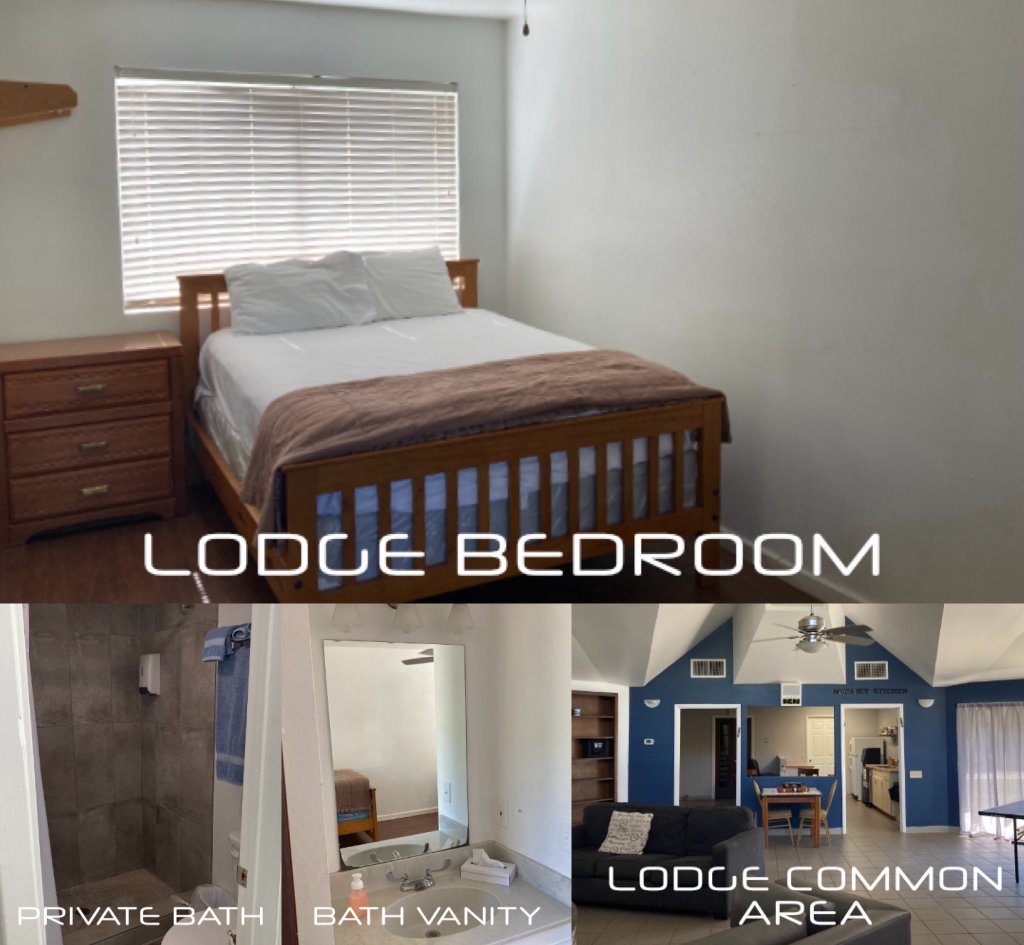 Each room in The Lodge comes with air conditioning, a queen bed and a single bed, a private bathroom with shower, plus towels and bedding. Guests also share a welcoming common area with a full kitchen, refrigerator, coffee maker, and laundry room. Tucked toward the back of the property, it’s about a 5-minute walk to classes, the pool, and the dining hall. The Lodge is a classic at yoga camp, and it’s well cared for and in good condition.