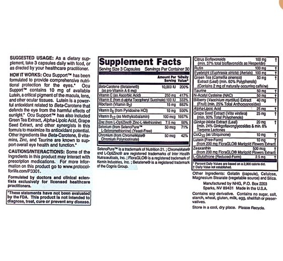 Ocu Support™ represents a comprehensive formula to meet the nutritional needs of the eyes.* This product features 10 mg of bioavailable lutein, a critical pigment that accumulates in the retina of the eye.* Lutein's function in the eye is to protect against the damaging effects of free radicals produced by sunlight.* Ocu Support™ also includes a full complement of essential nutrients known to support overall eye health and function, such as beta-carotene, zinc, taurine, and zeaxanthin.* ChromeMate® and L-OptiZinc® are registered trademarks of InterHealth Nutraceuticals, Inc.; FloraGLO® is a registered trademark of Kemin Industries, Inc.; Betatene® is a registered trademark of BASF SE.