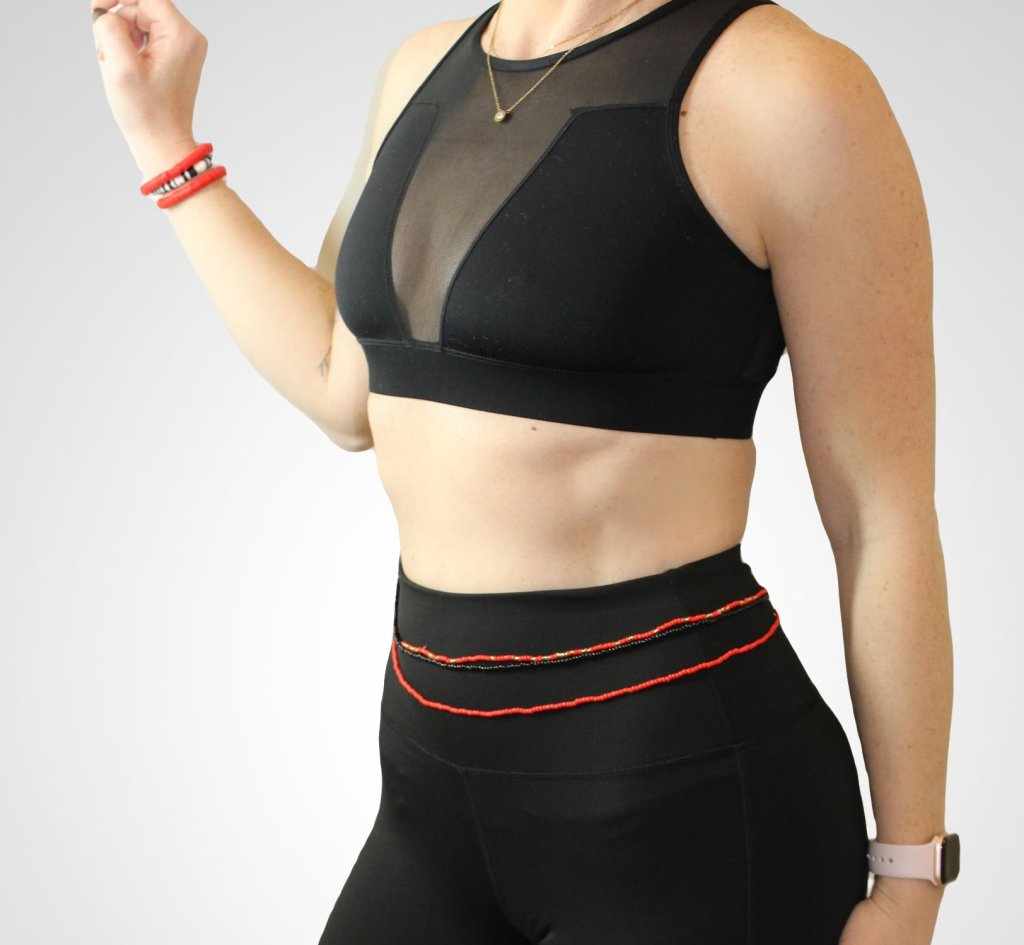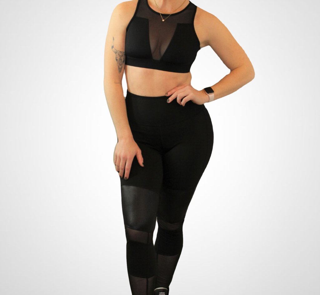 Faux leather legging set with sheer mesh panels. Mid-rise, high compression legging includes gold Swerk “S” branding above the glute seaming. Mesh-back bra includes matching branding along the back band. We recommend sizing up one size for cup sizes C and up.