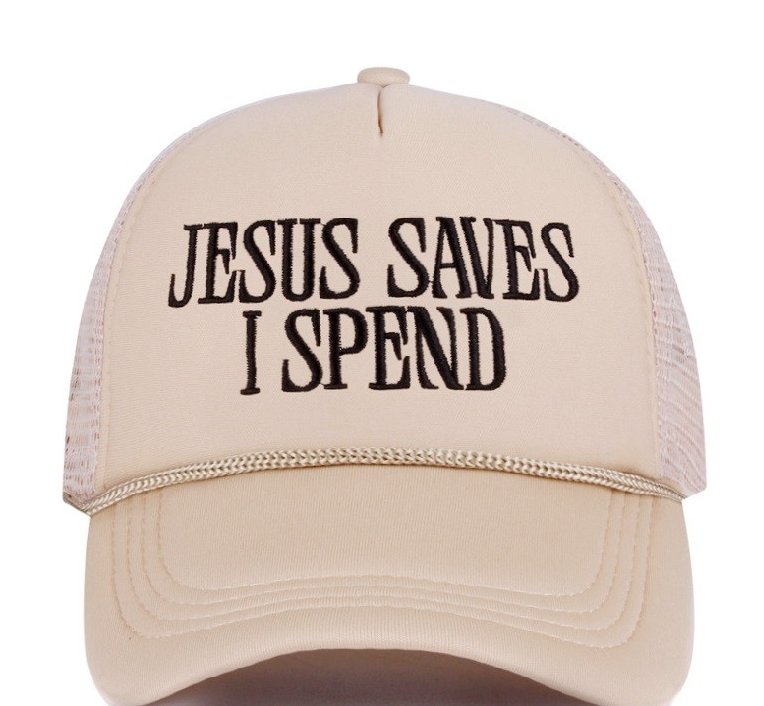 JESUS SAVES I SPEND MESH TRUCKER CAP - “JESUS SAVES I SPEND” EMBROIDERED - ONE-SIZE FITS MOST - MESH TRUCKER CAP - TRENDY HIP DESIGN