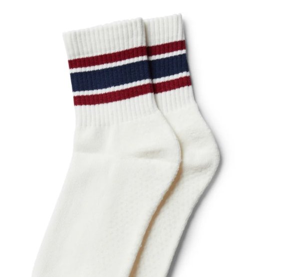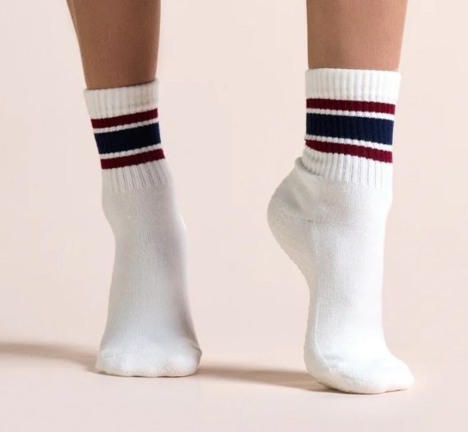 Inspired by a classic sports sock, the Retro Crew Grip Sock are the perfect pair of socks to add style to your workout look. Featuring an iconic sport stripe and a ribbed cuff, these socks will stay in place whilst you stretch and move during class. Made from a breathable cotton fabric, and featuring our signature “Join the Club” grip, these socks are the perfect blend of sporty chic.