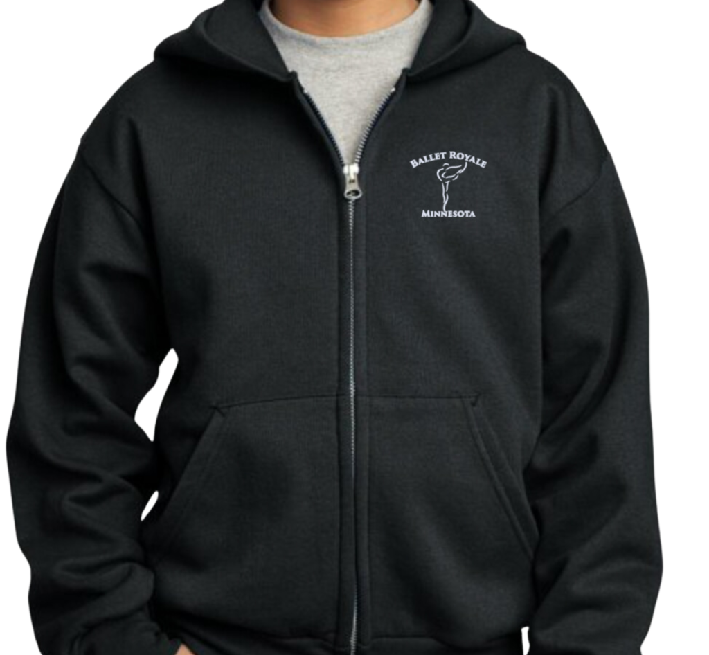 Ballet Royale logo 7.8-ounce 50/50 cotton/poly hoodie with no drawcords, front pockets, and metal zipper.