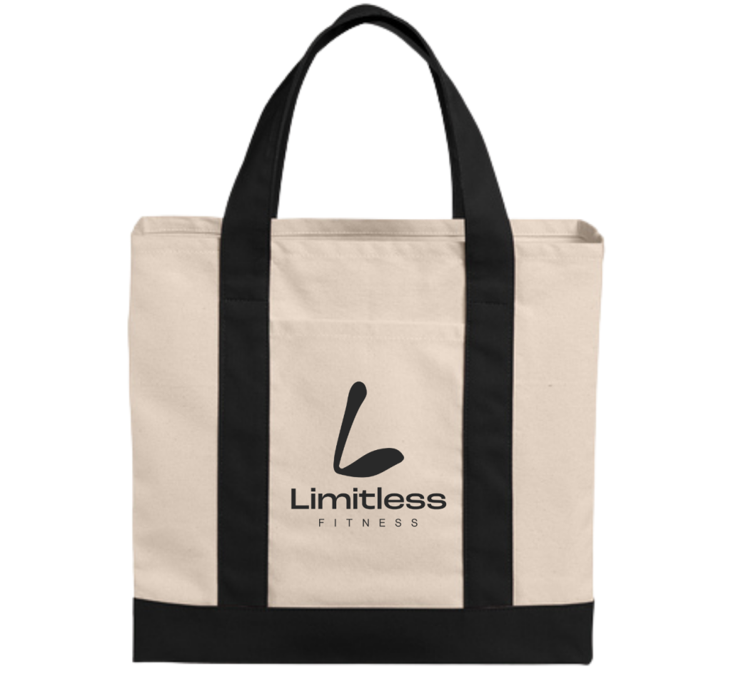 A sturdy 12-oz cotton canvas tote with reinforced bottom, black handles, and a front pocket. Spacious enough for daily essentials or gym gear while still simple and durable for everyday use.