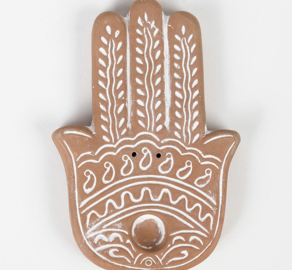 Handcrafted of terracotta, then handpainted with white designs, the Hamsa Incense Holder features an indent in the palm to burn an incense cone and two small holes at the base of the fingers for incense sticks. Silence, our fair trade partners in India offer people with disabilities opportunities for skills training and employment in handicrafts.