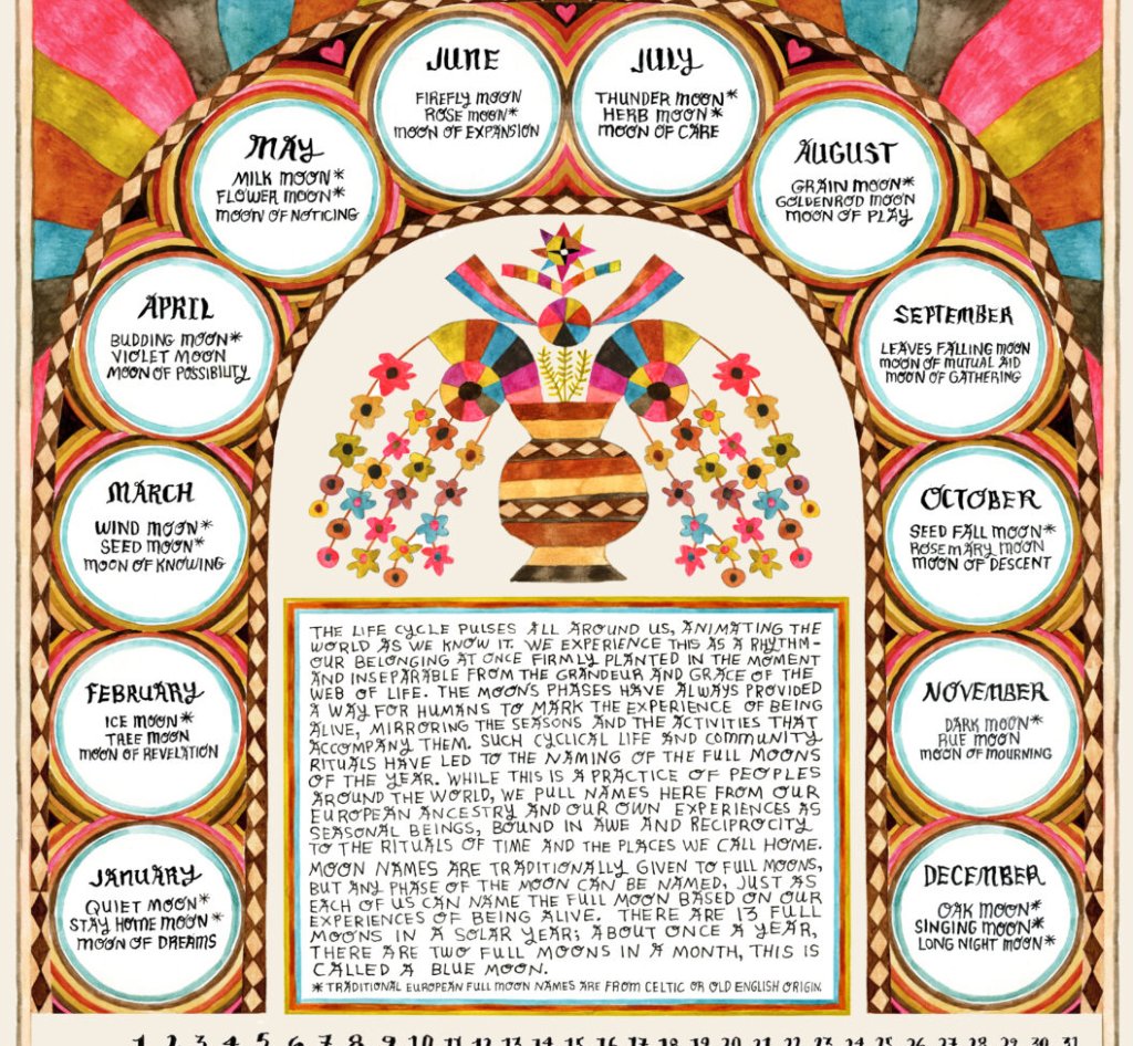 The 2026 Moon Calendar integrates the themes, impulses, and energies of each moon phase into diverse aspects of our lives. Each of the four moon phases correlates to a season of the solar year, one of the four elements of Earth, Air, Fire, and Water, and all of Nature’s energetic actions and impulses as they are experienced in the world around us and within our own psyches. Each moon phase also correlates to plants that grow in abundance during the corresponding solar season and that we may draw upon for support for our personal or collective transitions. 13 x 19-inch poster (standard frame size).
