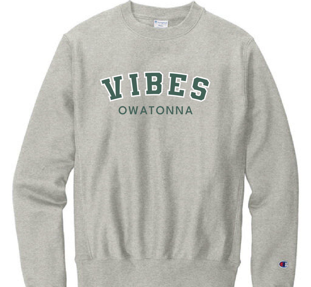 Light gray Champion sweatshirt with green VIBES Owatonna