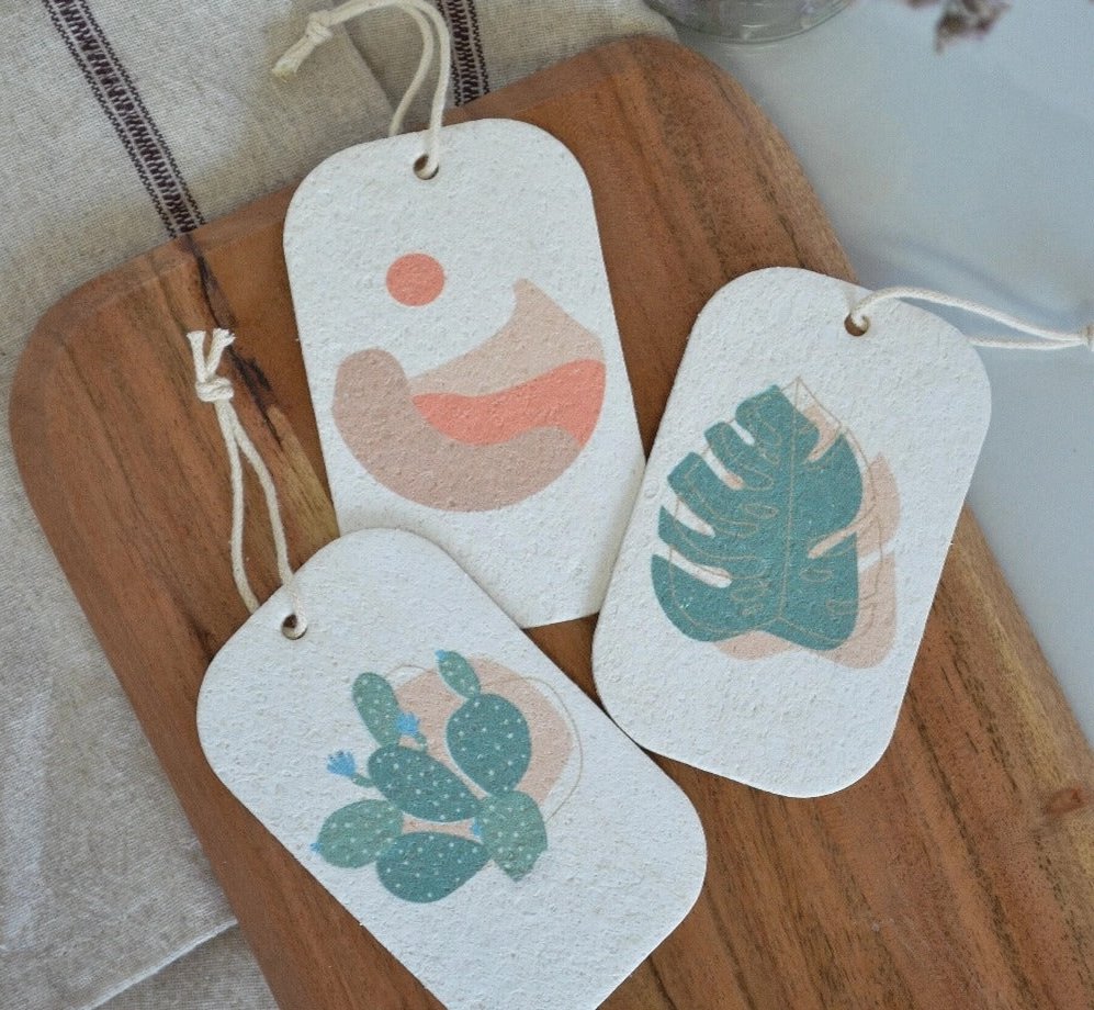 Introducing the 3-Pack Eco-Friendly Cellulose Dish Sponges, part of the Desert Collection. These biodegradable sponges are perfect for dishwashing and household cleaning, safe for use on multiple surfaces like glass and stainless steel. Measuring 3 inches in width, each sponge comes with a handy cotton loop for easy hanging. With a stylish beige/brown and green/brown color scheme, these sponges expand when wet, providing a sustainable alternative to traditional plastic sponges. Easy to care for, simply rinse, squeeze, and air dry after use, and when it's time to dispose of them, cut them up and compost for an environmentally friendly solution.